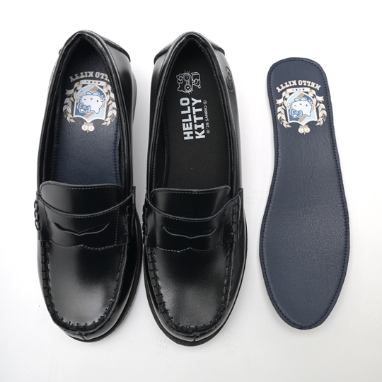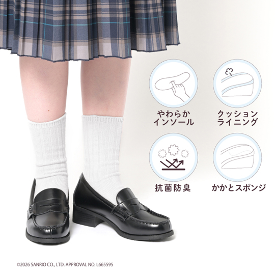 3,900円以上(税別)購入で「送料無料」 <26 新作アイテム> ハローキティがローファーの踵に! リバーシブルの中敷きで毎日違う表情を楽しめる POINT1 機能性と可愛さを融合したリバーシブルインソールで特別感を。 紺色が落ち着いた印象の合皮側にはエンブレムキティ、サラサラと爽快感のある黒メッシュにはお勉強キティ、どちらで使用しても可愛いキティがお出迎え。 ストッキングで前滑りが気になる時や、校則が厳しい時には黒のメッシュ側がおすすめです。 ※リバーシブルインソールは左右を入れ替えて使用してください。 POINT2 踵にはハローキティのリボンをワンポイントで。 POINT3 内側には全方位スポンジ入りメッシュ生地を使用。 ローファーは痛い!硬い!そんなイメージを払拭する足あたりの良さを実現しました。 <サイズ(cm)> 【22.5】【23.0】【23.5】【24.0】【24.5】 <スペック> 素材:合成皮革 ワイズ:3E その他:かかとスポンジ、クッションライニング、やわらかインソール、抗菌防臭 <着用コメント> ピッタリサイズをおすすめします。