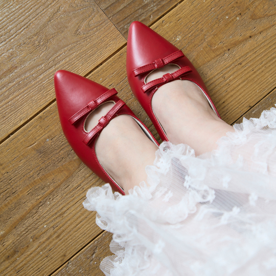 「立体的な平たいリボンが品が良く大人ぽくて可愛い! 春の赤は絶対におすすめ!明るすぎず渋くない、合わせやすい赤にこだわって選びました。」